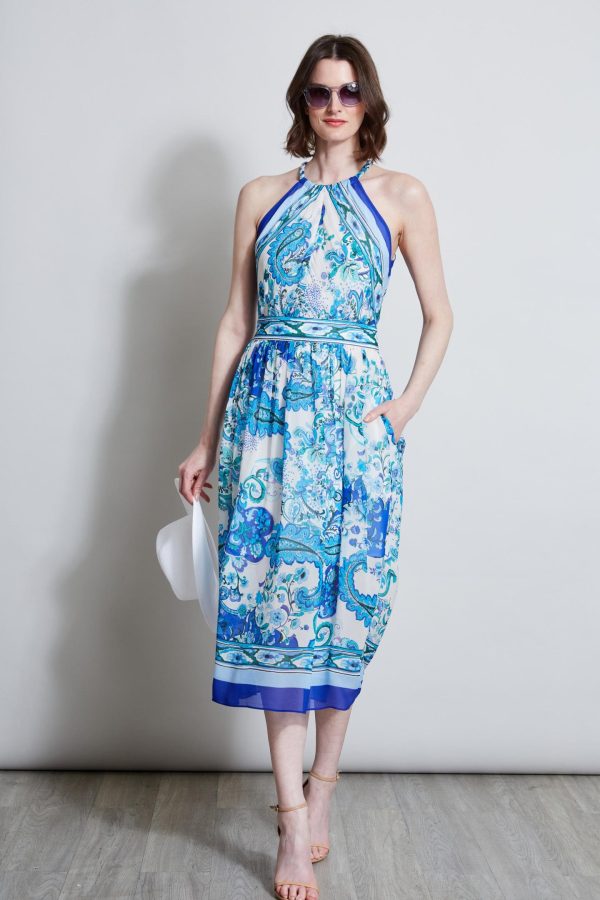 This bold, breezy dress is the dress your wardrobe has been longing for. Romantic and flirty, our Georgette Halter Dress will work overtime in your summer closet- whether day or night. Designed in Elie’s Favorite Calypso print, the halter neckline is finished with a braided cord detail while the engineered print accentuates the waist. The artistic scarf print & midi silhouette make this dress a standout for your next vacation and throughout your Spring wardrobe layered under a jacket.