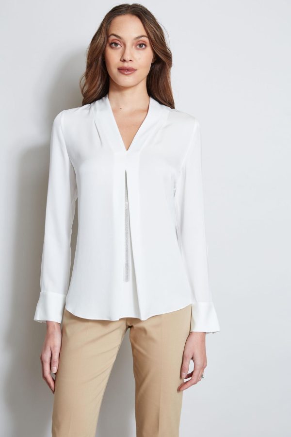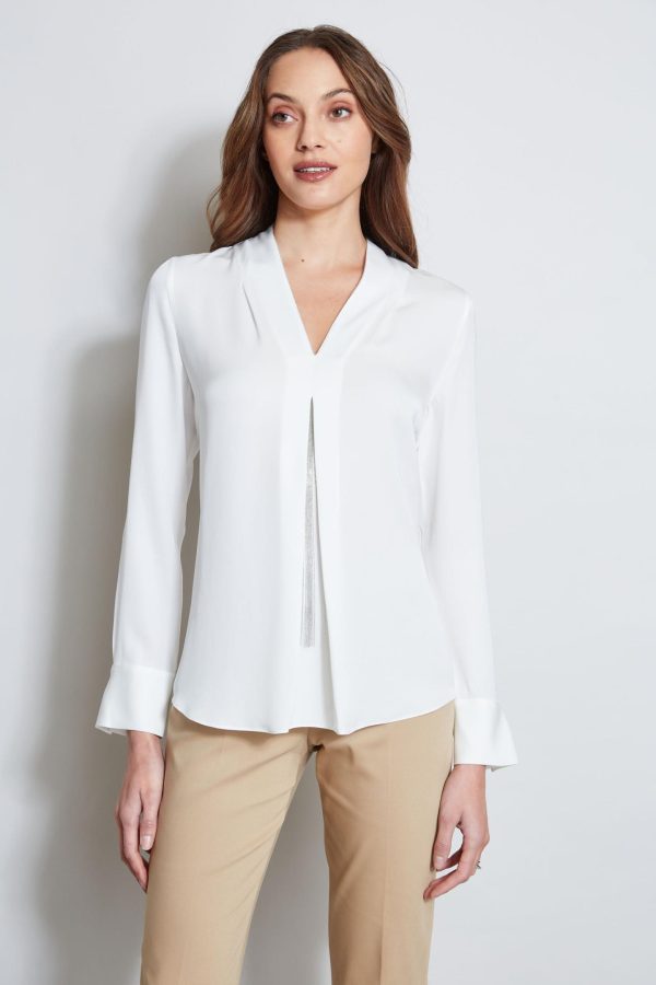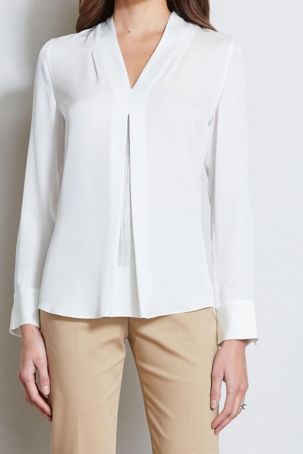 - Long Sleeve Silk Georgette V-Neck Shirt with Chain Fringe Detail