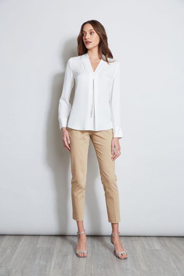 Monili Chain lends our Silk Georgette shirt a modern chic attitude. The flattering V-neck is detailed with chain trim and a delicate fringed chain. A modern staple that you’ll reach for again and again. Dress it up or down.