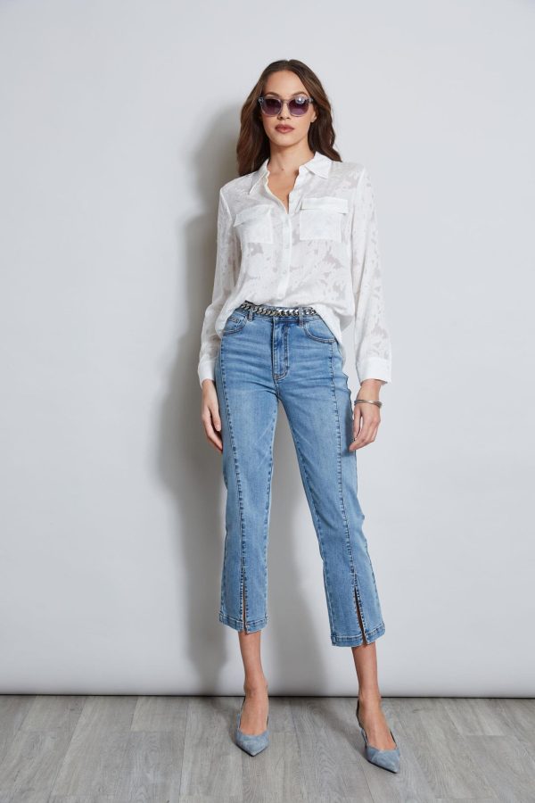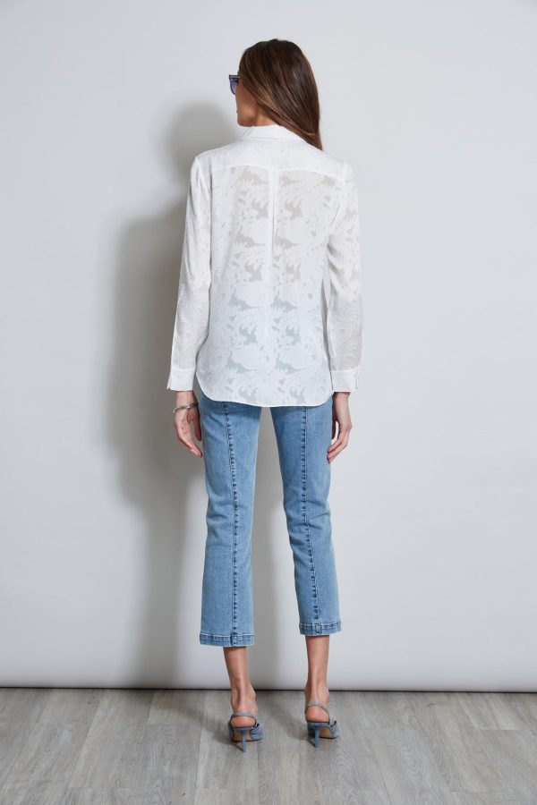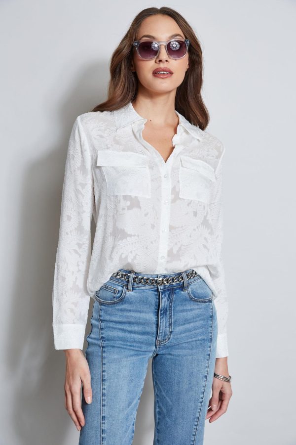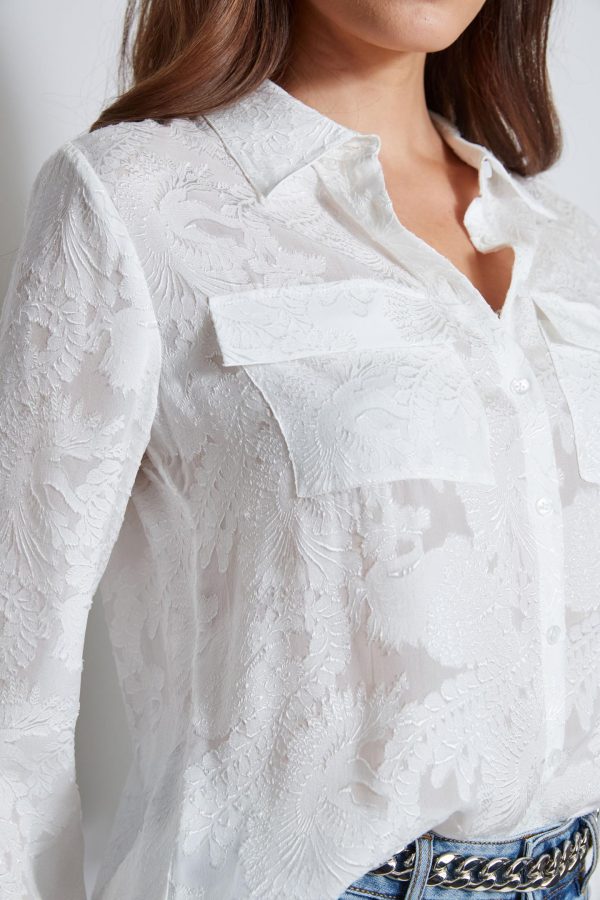 - Washed Silk Jacquard Long Sleeve Button Down Top with Utility Patch Pockets