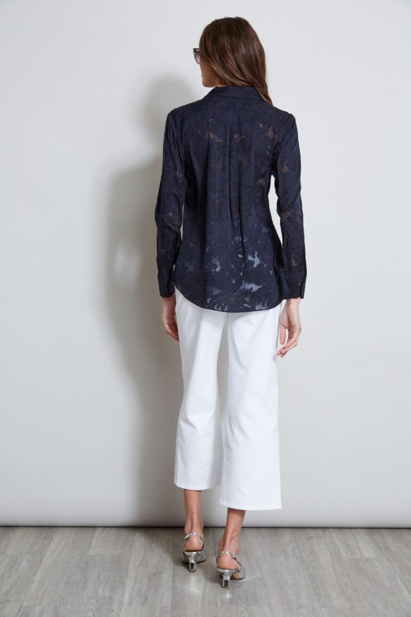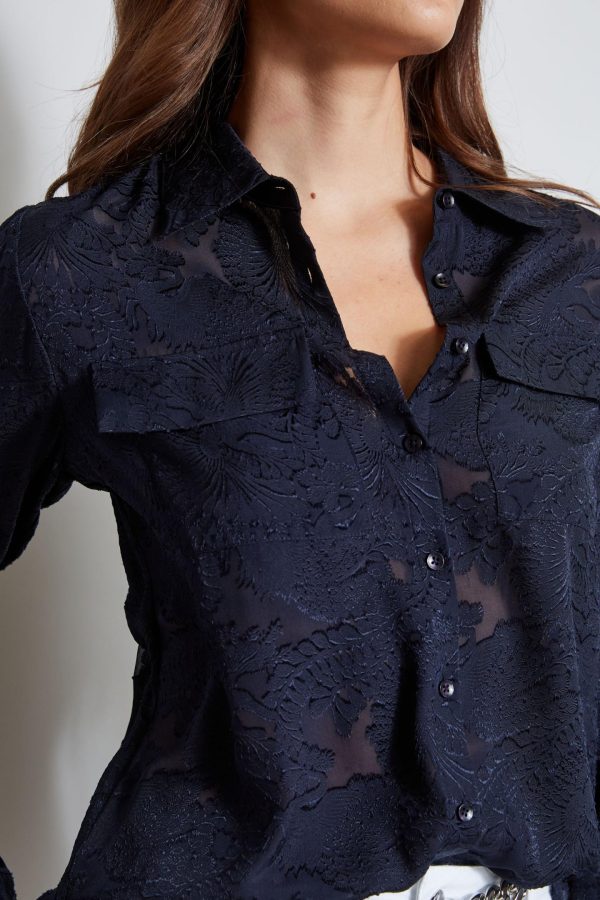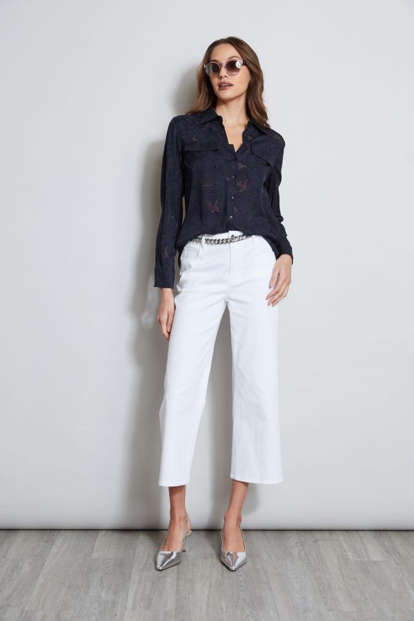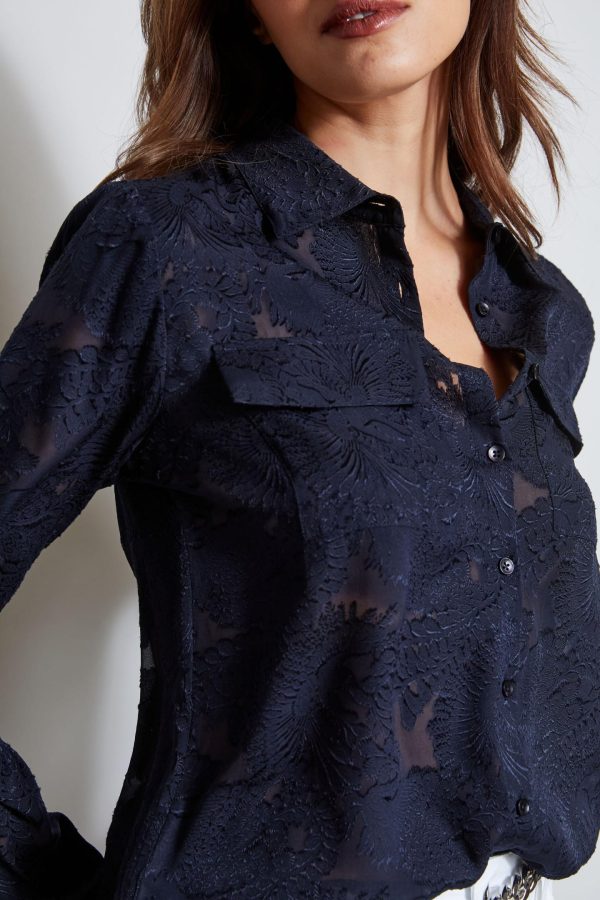 - Washed Silk Jacquard Long Sleeve Button Down Top with Utility Patch Pockets
