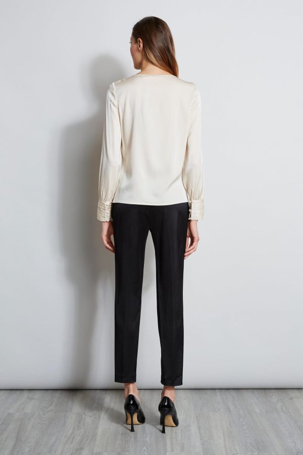 - Long Sleeve Silk Satin Blouse with Asymmetric Neckline & Pearl Bar Detail