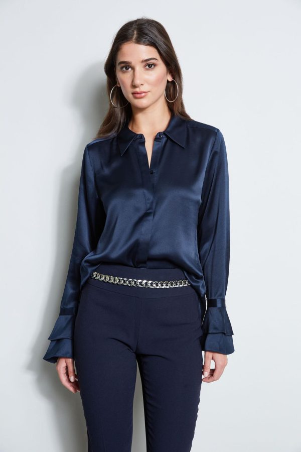 - Long Sleeve Silk Satin Button Down shirt with Hidden Placket & Tiered Ruffle Cuff