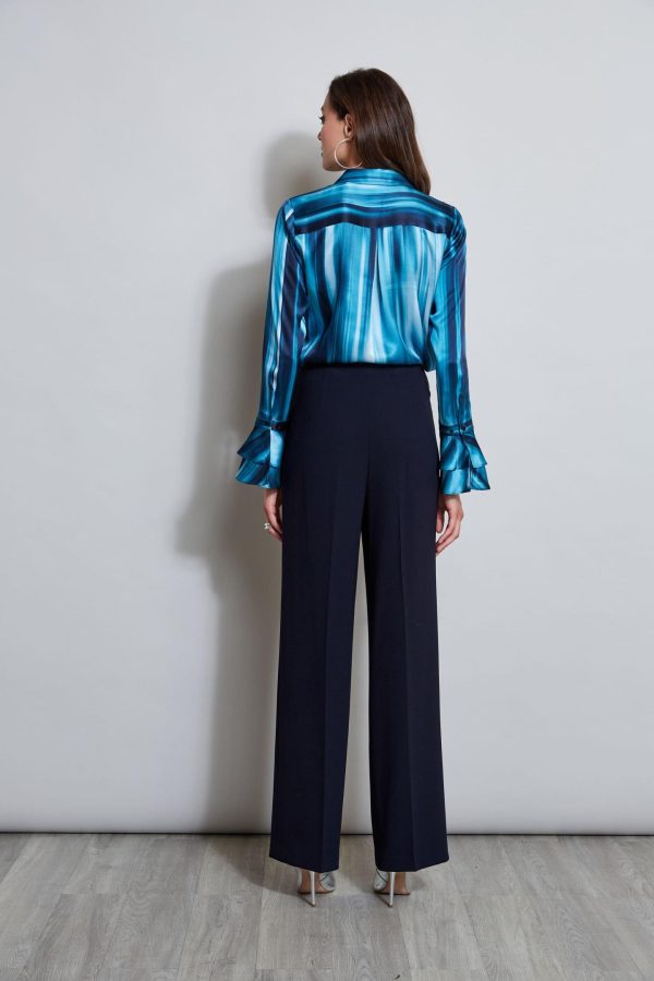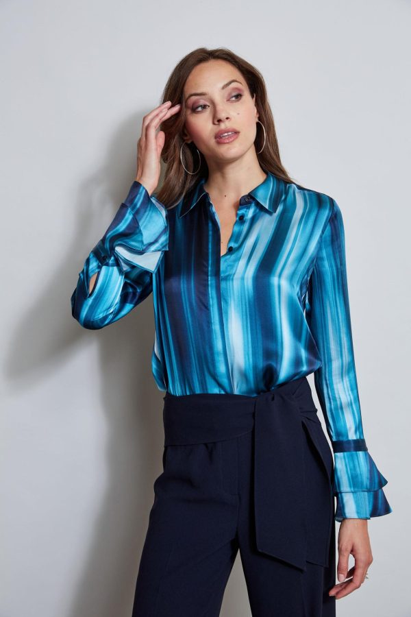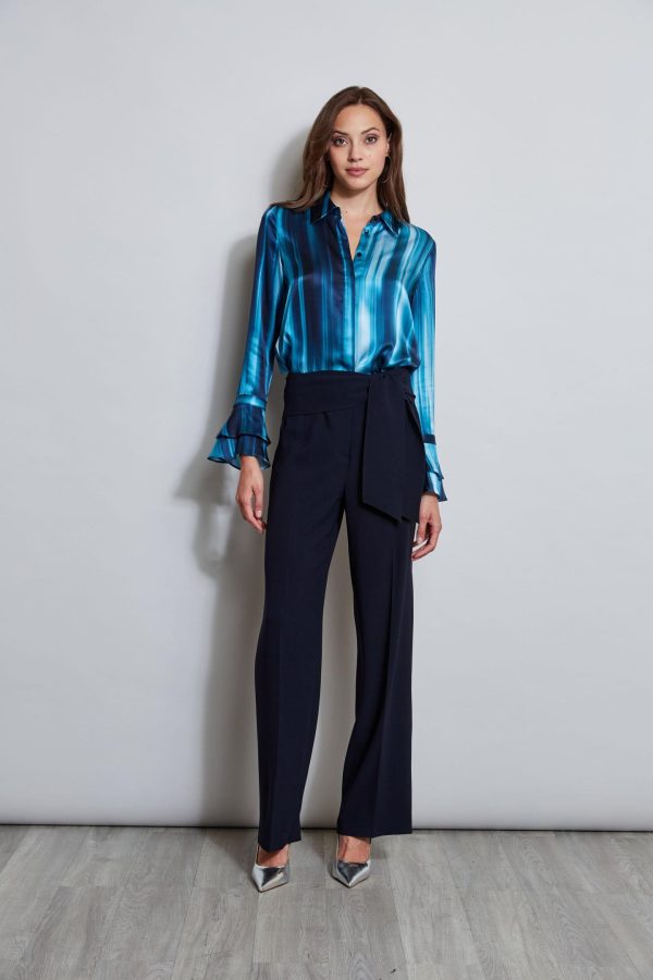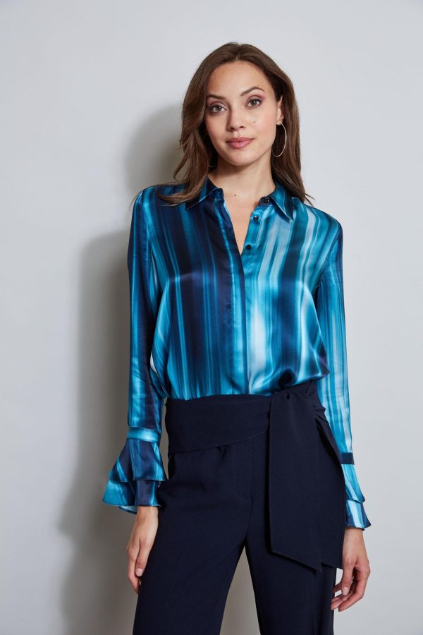 Our Watercolor Ribbon Stripe print takes a modern turn in Luxe Silk Satin. Its chic hidden button-down placket and tired ruffle cuffs lend a femme sporty vibe to this must-have shirt. Pair it with vegan leather or our chic tie side pant for the perfect Fall look.